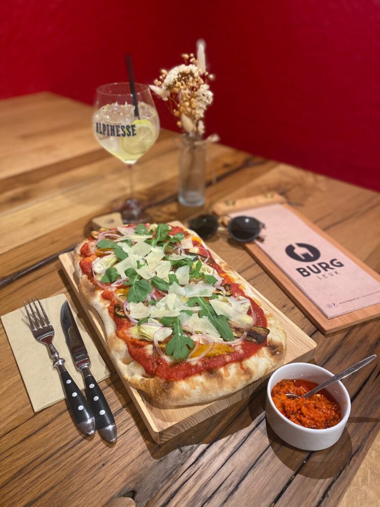 Die Pinsa passt perfekt als Snack-to-share zu einem gemütlichen Apéro unter Freunden, wie auch als Mahlzeit am Mittag oder Abend. Ein richtig leckerer und bekömmlicher Allrounder welcher zu jeder Zeit und jeder Gelegenheit passt! Die Pinsa ist als normale Portion (Bild) wie auch als halbe Portion erhältlich. Geniess unsere Pinsa vor Ort im Burg oder nimm sie mit.Take-away ist bei uns auch möglich.